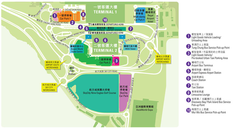 For a bigger version of the map, please click the following link: http://www.hongkongairport.com/eng/img/transport/map/terminal.jpg 2. Airport-Hotel Shuttle (Trans-Island Limousine) ~ HKD $130/person/trip Approx. 45mins Website: http://www.trans-island.com.hk/eng/ Trans-Island stand is located at B01 inside the Airport Arrival Hall. (Please see the map below) The schedule of the shuttle is from 05:00am to 01:00am every 30 minutes.